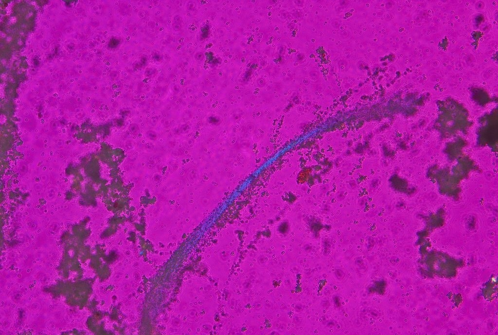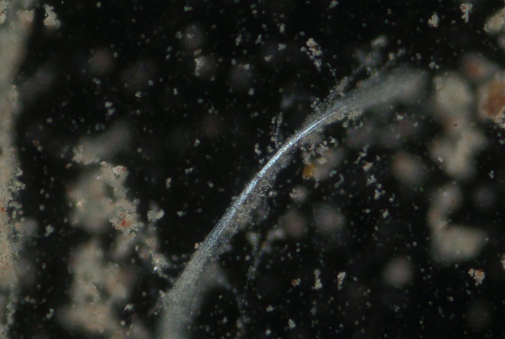 推定含有率は『0.1~5%』です。石膏ボードに含有している際、石膏本体ではなく紙にクリソタイルが含有していることもあるので気をつけて分析しています。クリソタイルは顕微鏡でみると綺麗な繊維状をしているので防湿性を上げる為に使用されたものと考えられます。ベスターでは上記の通り、試料の表面観察や層別分析に加えてフィルター上の残渣の分析も2人以上で行っています。是非ご利用ください!