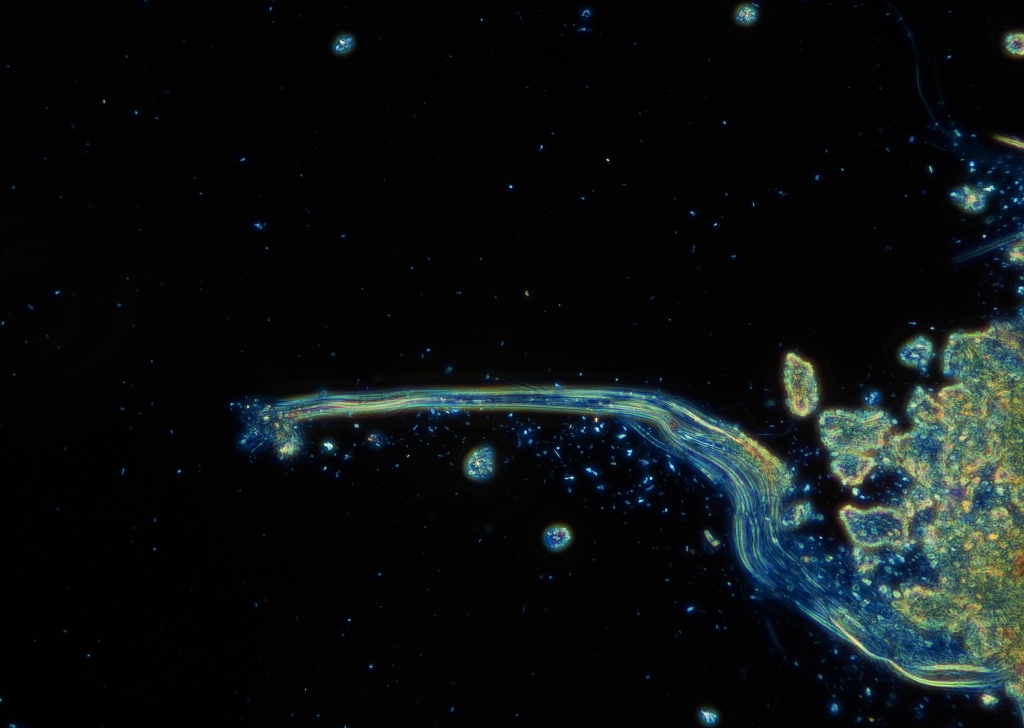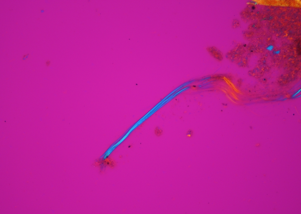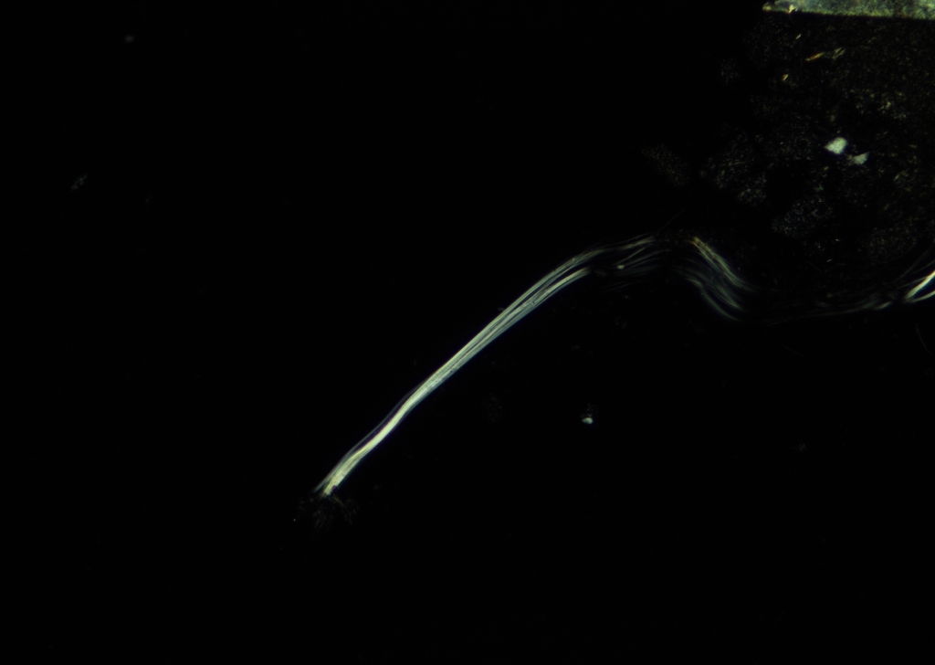 フィルター上の残渣でアスベスト(クリソタイル)様の繊維を確認した後、塗材から順に層別分析をおこなっていき、最後の下紙からアスベストが検出されました。