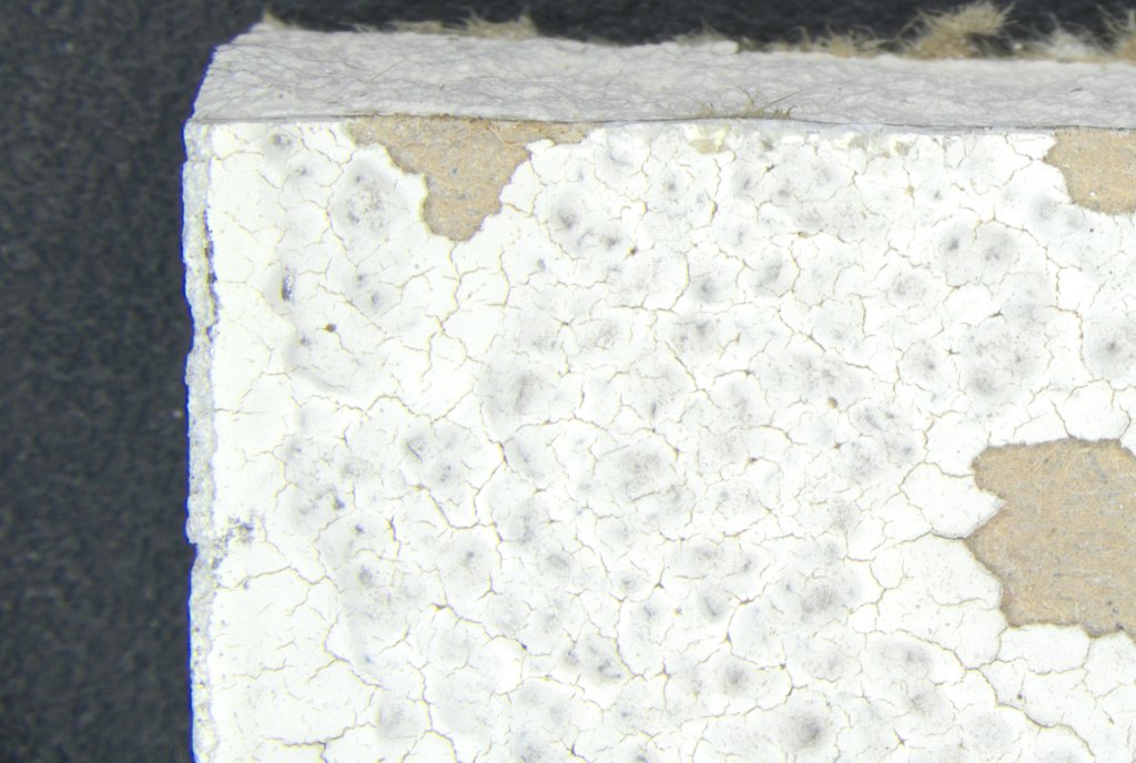 建材用に使用される石膏ボードの作り方は2枚の石膏ボード原紙の間に石膏を流し込んで造られています。そのため層別分析を行う際、石膏ボードは紙、石膏、紙の3点セットで石膏ボードとしています。今回の検体は表面に塗材が塗られていたため、表面側から白(塗材)、茶(紙)、白(石膏)、茶(紙)の4層で構成されていました。