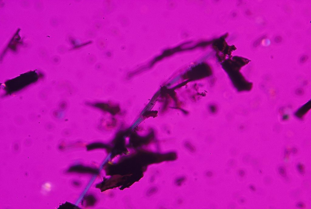 フィルター上から、アスベスト(クリソタイル)様の繊維が見つかったので、検体の表面側から順に層別分析を行ったところ、4層目、茶(紙)からクリソタイルが見つかりました。推定含有率は『0.1~5%』です。今回の分析例の通り、石膏ボードにアスベストが含有している際、紙の部位に含有していることが多いです。石膏ボードの建材を廃棄or再資源化される際、中間処理場で紙と石膏に分離する必要がありますので是非、弊社の層別分析サービスをご利用ください。