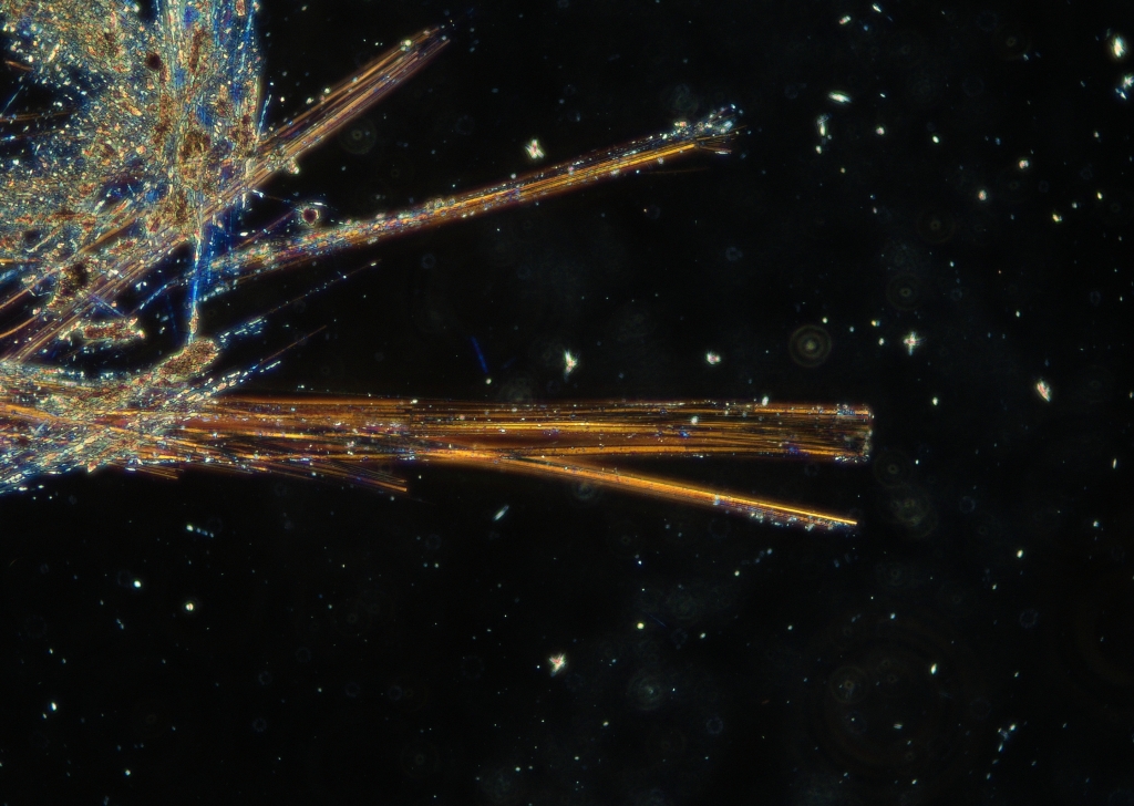 先端の枝分かれがあり、さらに伸長の符号・分散・位相差の観察時にはクリソタイルみたいに見えなくもない細い繊維…