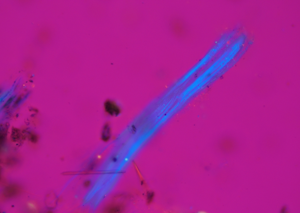 実体顕微鏡で検体を見たところ、アスベストのような繊維が見えたため、今回は前処理せずそのまま顕微鏡観察しました。