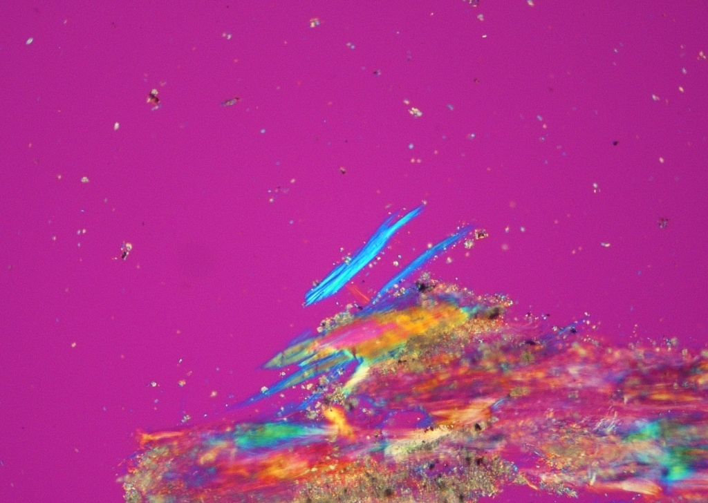 建材から繊維を抜き取り、細心の注意を払って作成したプレパラートを偏光顕微鏡のもとへと誘います。