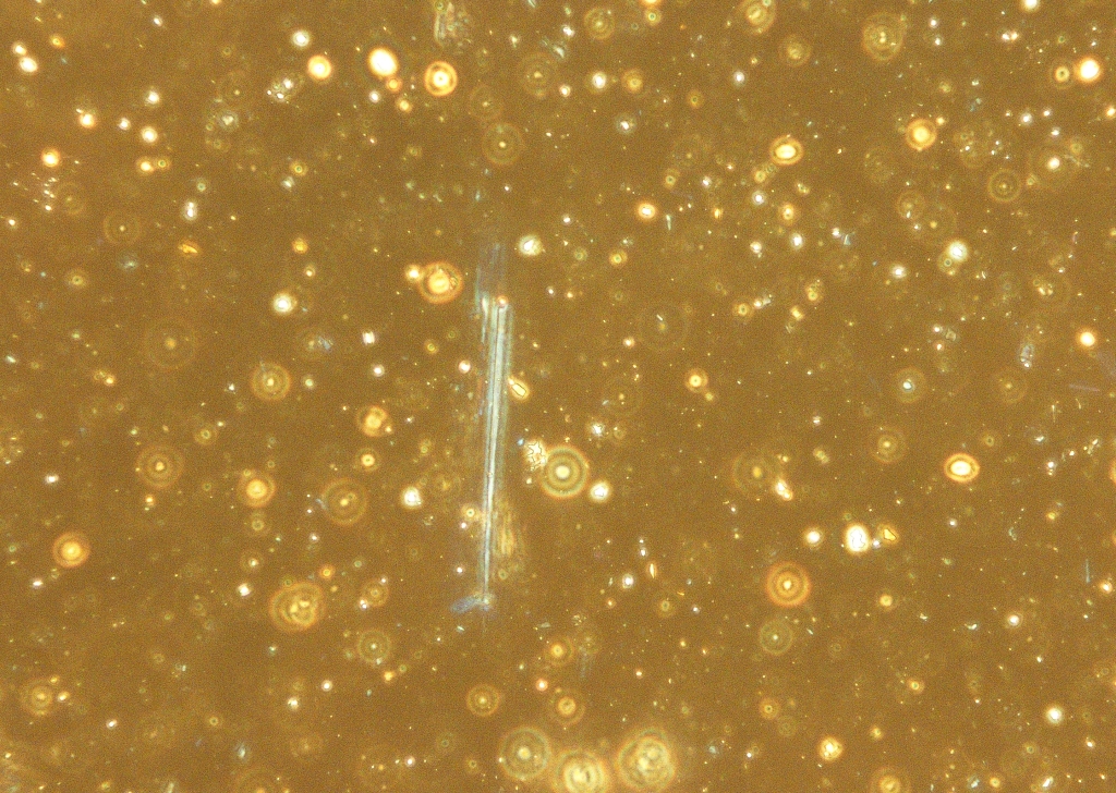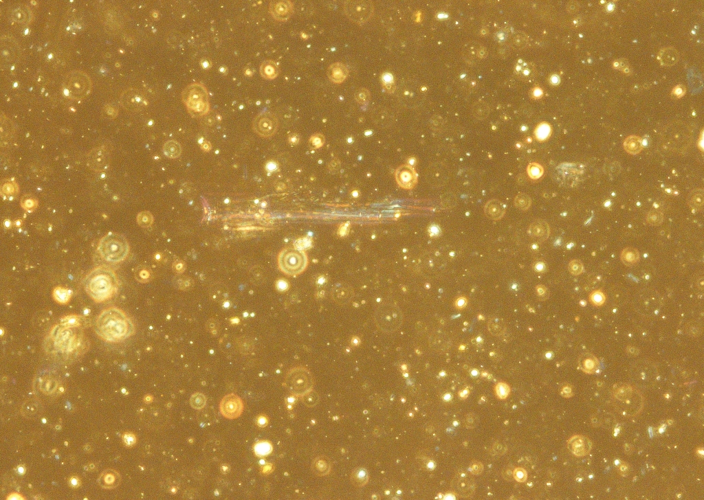 今回の検査で検出した繊維からもそうしたアクチノライト様の形状及び挙動が確認され、無事に同定したわけですが、そもそもが小さな繊維であるために発見が容易ではなく、入念な観察が必要です。