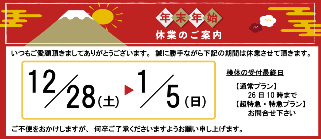 年末年始営業のご案内 《 2024年12月3日 》 平素は格別のご高配を賜り厚く御礼申し上げます。さて、弊社年末年始期間中の休業日を下記の通りご案内させて頂きます。期間中はご不便をおかけしますが、何卒ご了承賜ります様、よろしくお願い致します。 « PREV NEWS NEXT NEWS » お知らせ一覧